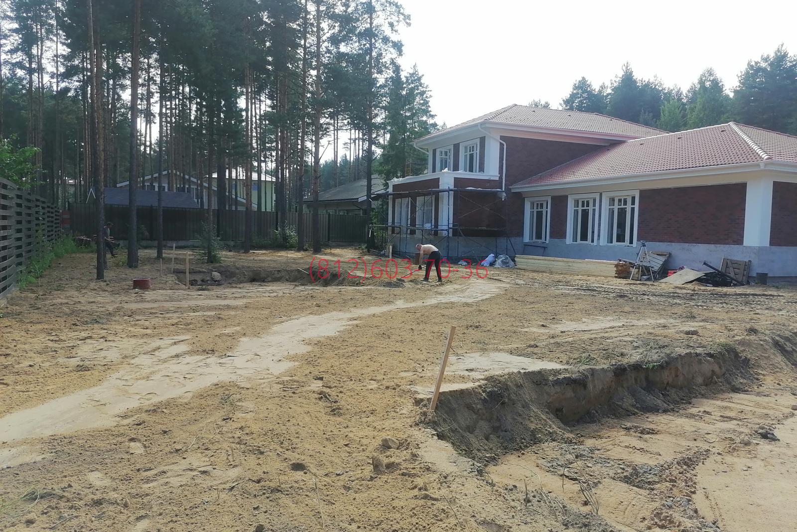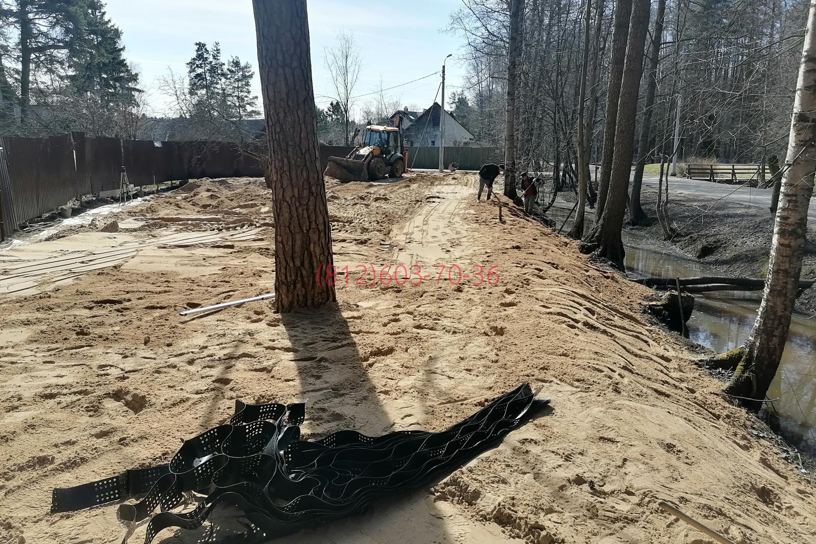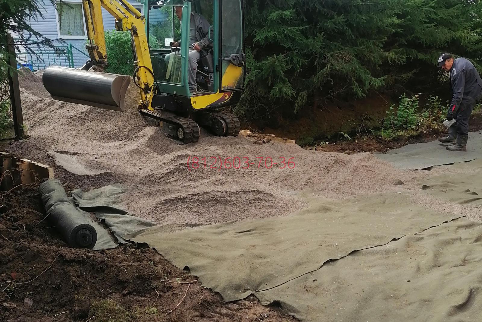 2021-11-11 Планировка дачного участка в котеджном поселке Южная Дача, Ломоносовский район Ленинградской области. Монтаж заезда, организация парковки, поверхностная отсыпка песком.